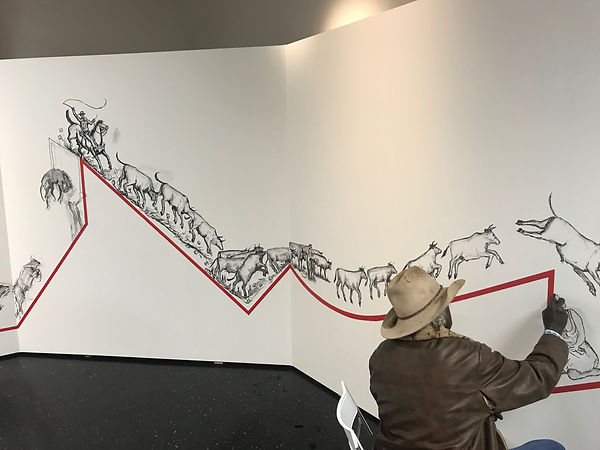 For Tarnanthi Festival 2017, artists Mervyn Street and Robert Hannford collaborated on 'Abstracted Muster'. At CASA gallery, Adelaide, over several days the artists drew the muster of cattle, horses, and horsemen upon and over an abstract line, previously designed by an arts student, drawn across the gallery walls. I worked and became friends with Mervyn from my time in Fitzroy Crossing, the Kimberley, WA. Robert is a family friend of mine, and has been an inspiration for me for a long time.